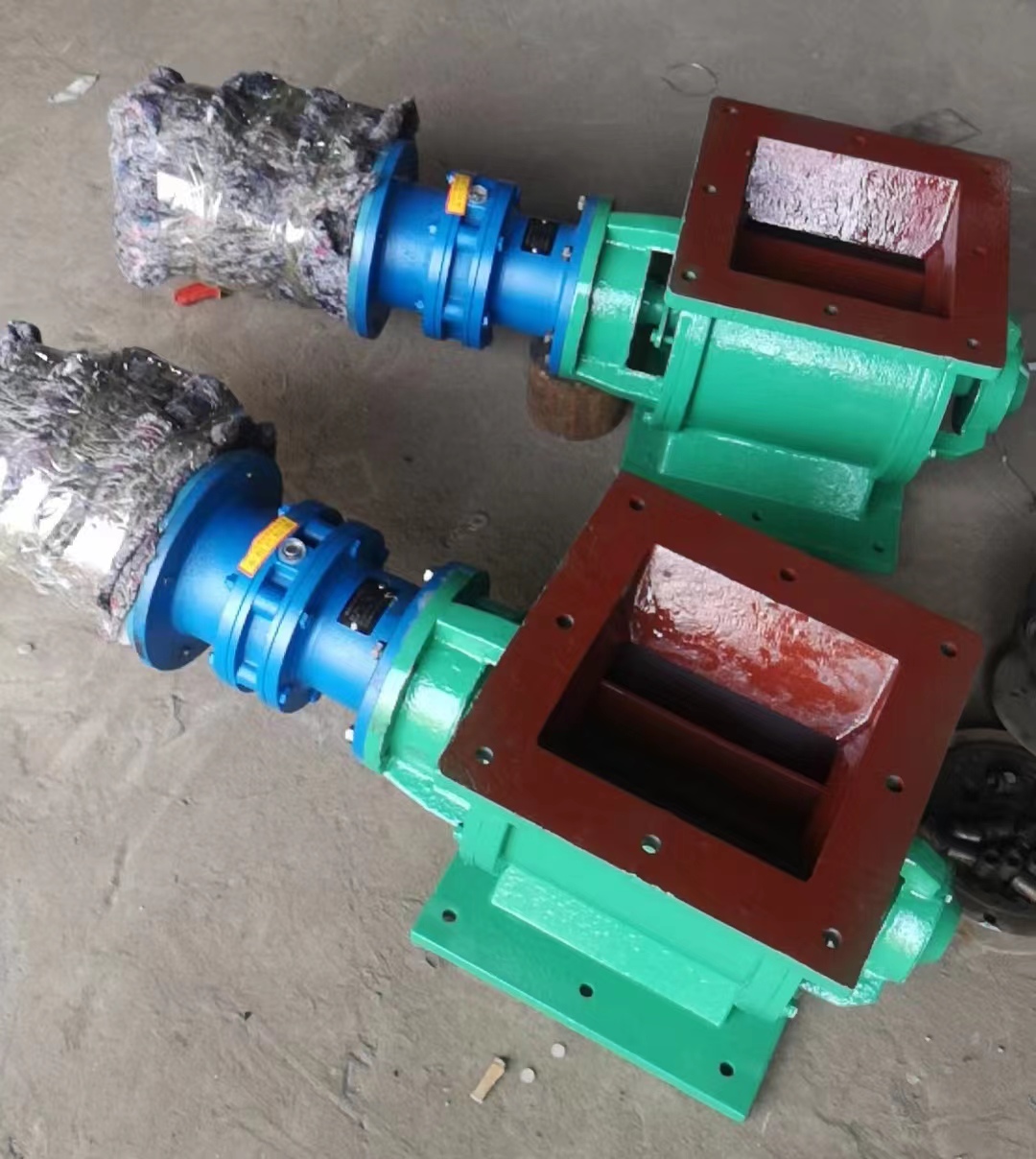 旋轉(zhuǎn)卸料器閥體和葉輪可用鋼板焊制,也可鑄造,采用鑄種造結(jié)構(gòu)葉片性好,葉片與傳動(dòng)軸鋼型連接結(jié)構(gòu)緊湊工作,輕便節(jié)能。星型卸料器工作時(shí),粉塵靠重力落入,充滿上面和側(cè)面的星型葉片空格。葉片轉(zhuǎn)子由電動(dòng)機(jī)通過減速機(jī)轉(zhuǎn)動(dòng)軸帶動(dòng),葉輪轉(zhuǎn)到下部粉塵靠自重卸下。這種卸塵器一般都安裝在除塵器灰斗下部,為確定連接處的嚴(yán)密不漏風(fēng),在回轉(zhuǎn)卸料器的上部應(yīng)經(jīng)常保持(儲(chǔ)存)相應(yīng)高度的粉塵。因?yàn)槿~輪轉(zhuǎn)動(dòng)時(shí),卸完粉塵后葉輪轉(zhuǎn)上的那一面經(jīng)常是沒有粉塵的,所以容易使空氣漏入。為了保持相應(yīng)高度的灰柱,而且不致卸空,應(yīng)該在灰斗內(nèi)裝設(shè)料位信號(hào)設(shè)施,并與卸塵閥的電動(dòng)機(jī)建立連鎖。