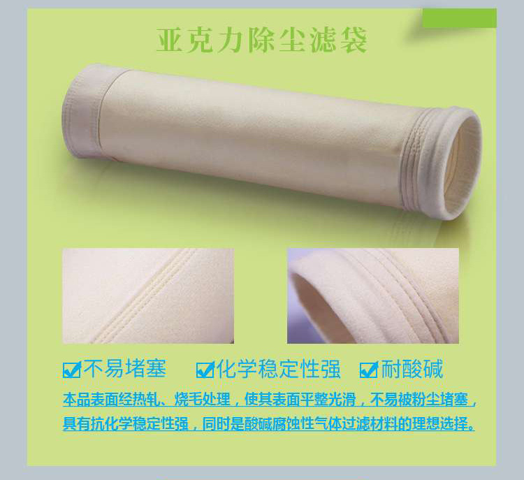 亞克力中溫除塵布袋化學(xué)名均聚丙烯腈,用它為原料經(jīng)針刺法制成氈,然后經(jīng)過(guò)特殊的拒水處理從而得到亞克力中溫抗水解針刺過(guò)濾氈。產(chǎn)品具有優(yōu)良的耐化學(xué)性和抗水解性,廣泛應(yīng)用于垃圾焚燒、瀝青、噴舞干燥器、煤磨、電廠等煙氣的收塵行業(yè)。